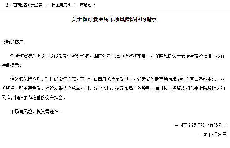 市场暖意融融,但风险也不容忽视。近期贵金属价格剧烈波动,从一周前43年来最惨烈的单周暴跌,到如今的强势反弹,“过山车”式的行情,也让市场不确定性显著上升。在此背景下,中国工商银行、中国银行、中国建设银行、中国民生银行等多家银行,纷纷发布贵金属市场风险提示公告,用最贴心的提醒,守护投资者的财富安全。