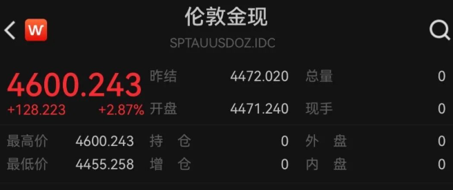 当日,国际黄金市场表现亮眼,成为全球金融市场的焦点。伦敦黄金现货盘中一度突破4600美元/盎司关口,日内涨近3%,虽随后略有回落,但截至发稿,仍报4591.28美元/盎司,涨幅达2.67%;COMEX黄金期货表现更为强劲,价格一度攀升至4599美元/盎司,涨幅超4%,最终收于4581.6美元/盎司,涨幅维持在4.10%。这一场强势反弹,也打破了此前市场的震荡阴霾,让不少关注黄金的投资者感受到久违的暖意。
