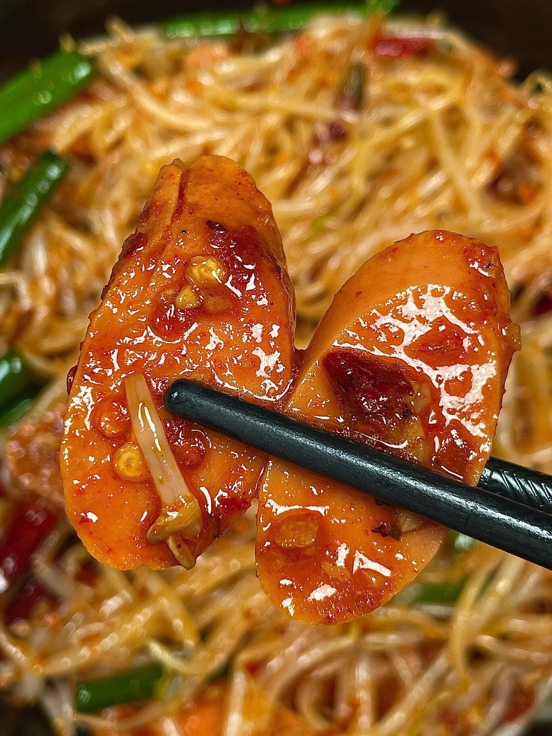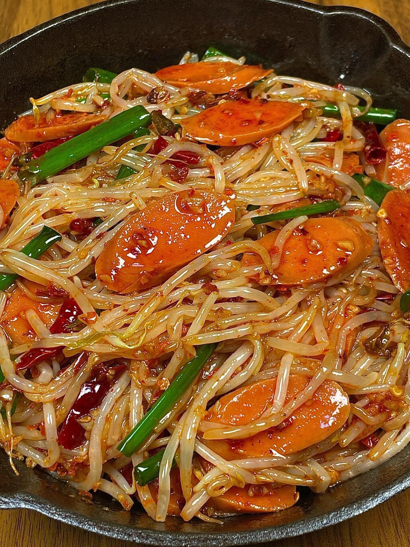 等火腿肠煎到两面微焦,推到锅边,把蒜末和干辣椒段丢进锅底的油里,小火煸出香味。注意火别太大,辣椒糊了会发苦。闻到蒜香味后,马上把沥干水的豆芽倒进去,转大火!这是整道菜最关键的一步:大火快炒。