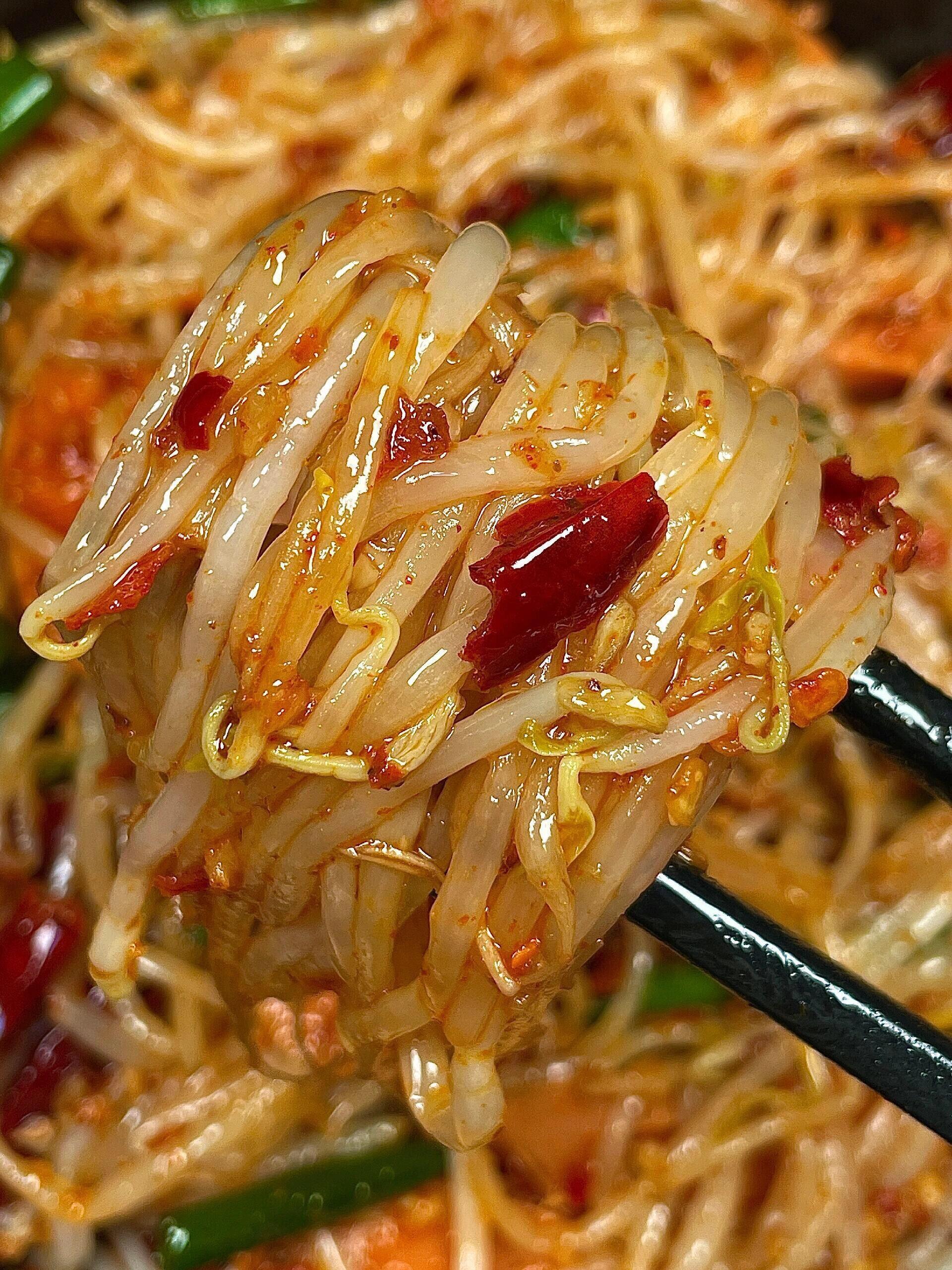 豆芽一进锅,会发出"哗"的一声,然后迅速变软出水。这时候要快速翻炒,让每一根豆芽都裹上油香。大约炒一分钟,豆芽变得半透明、稍微变软就可以了,千万别炒太久,软塌塌的豆芽就失去了灵魂。