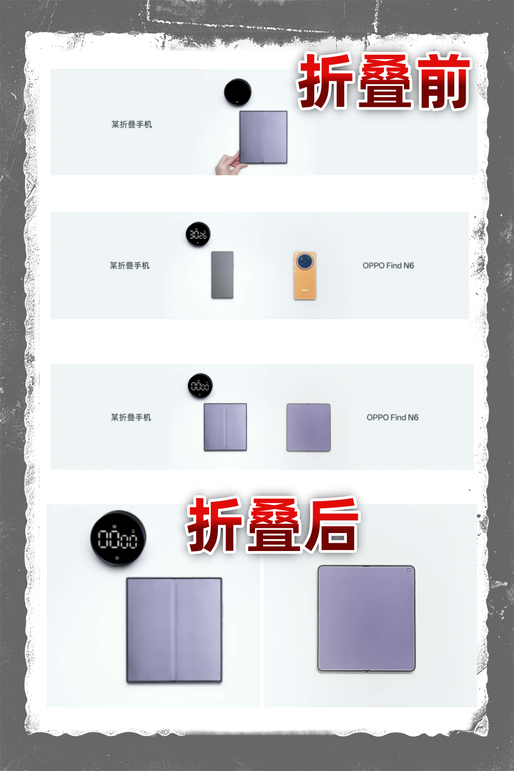 而且发布会上居然还摆出了OPPO Find N6和其他机型的对比——折叠前后差别居然那么大!友商折叠前就已经隐隐约约看到折痕了,折叠后就更明显了,而OPPO Find N6从始至终都没折!