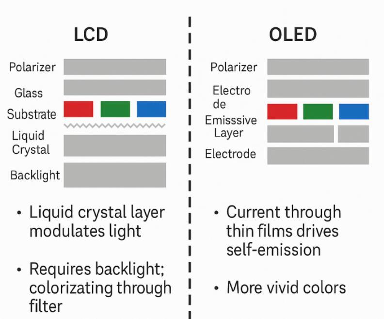 之前的LCD技术就像是皮影戏,显示画面靠背板的光源“透出来”。而印刷OLED技术就是让像素点按需发光,直接显示RGB色彩。由于颜色光源不再依赖背板透光,OLED相比LCD能做到极高的对比度,黑色纯粹、亮色通透。
