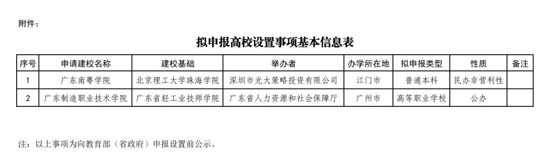 根据公示信息,拟申报的广东南粤学院由深圳市光大策略投资有限公司举办,为民办非营利性普通本科院校;广东制造职业技术学院由广东省人力资源和社会保障厅举办,为公办性质高等职业学校。