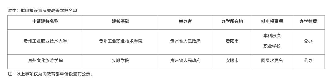 拟申报的贵州工业职业技术大学为公办本科层次职业学校,办学地址在贵阳市;拟申报的贵州文化旅游学院为同层次更名,办学地址在安顺市。