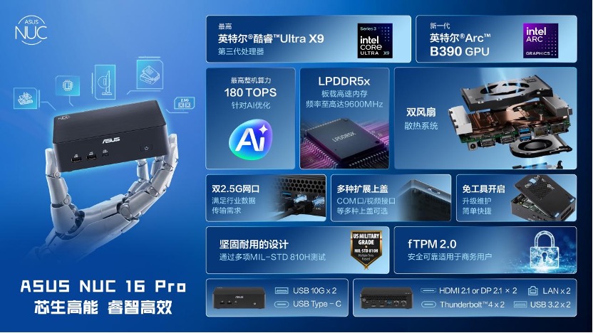 除了强悍的AI能力,ASUS NUC 16 Pro的综合表现同样出色,无论是便携性、扩展性还是安全稳定性,都能满足不同用户的需求: