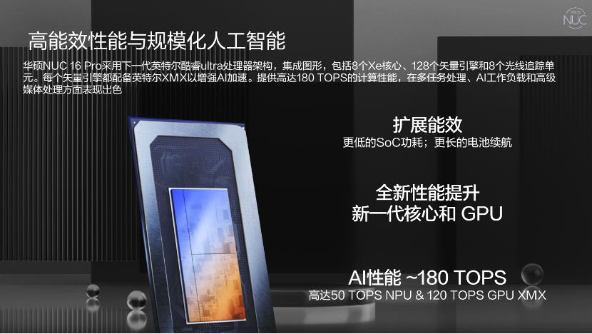 在AI技术全面渗透日常办公、创作与企业运营的今天,“云端依赖”早已成为效率提升的绊脚石——延迟卡顿、隐私泄露、API调用限制,这些问题都在倒逼我们寻找更高效、更安全的AI解决方案。而华硕ASUS NUC 16 Pro的出现,有力打破了这一困局,它以0.7L的极致迷你机身,搭载Intel® Core™ Ultra处理器,融合第五代NPU与Arc™ B390超级核显,释放出180TOPS的澎湃AI算力,让强大的AI能力不再局限于云端,实现触手可及、随用随取。