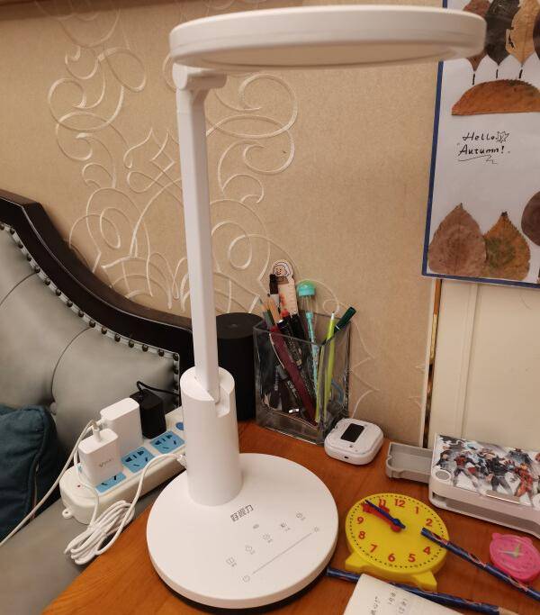 台灯哪个牌子的比较好保护视力的?好视力TG035给人的第一印象是干净利落,小巧的外观搭配纯白的色调,不仅显得清爽,也容易融入各种桌面环境。灯身配有两个可调节关节,调节起来很顺手,虽然它的照明范围不算特别宽,但用来照亮学习区域或者书本阅读区已经足够。灯头直径约14cm,照射面积可覆盖一米左右的桌面,算是比较实用的尺寸。底座上的触控区域操作灵敏,调节亮度不费劲,而且带有环境感应功能,能自动根据周围光线调整亮度,减少手动操作的频率。虽然它不是全光谱台灯,色彩还原度不算极致,但日常使用中灯光柔和,不容易刺眼。