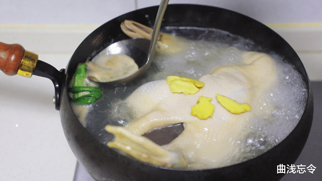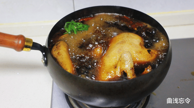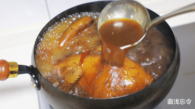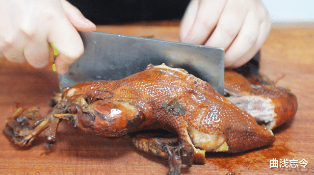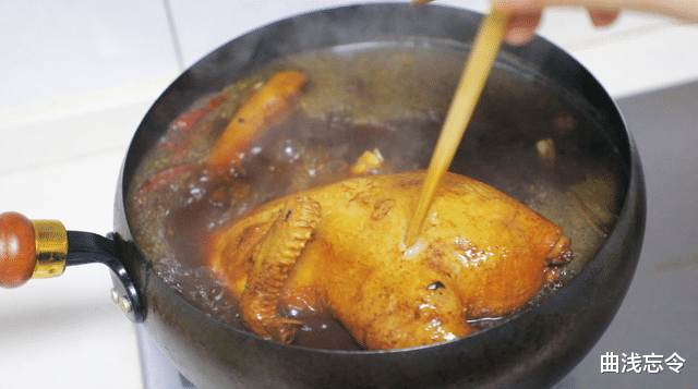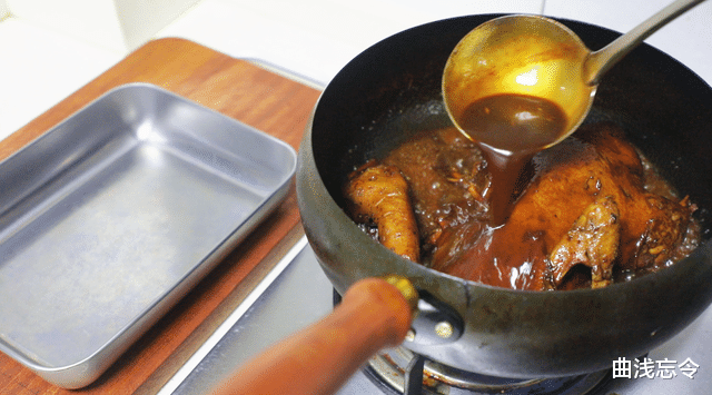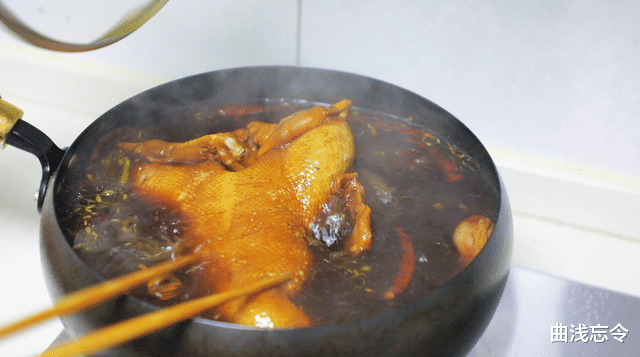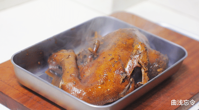 6、晾凉:捞出鸭子晾凉,卤煮过滤出来,一半浇在鸭子身上,另一半等切好后再浇。