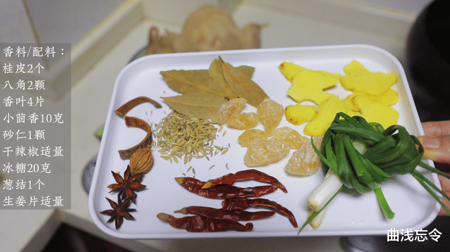 配料:桂皮2个、八角2颗、香叶4片、小茴香10克、砂仁1颗、干辣椒适量、冰糖20克、葱结1个、生姜片适量