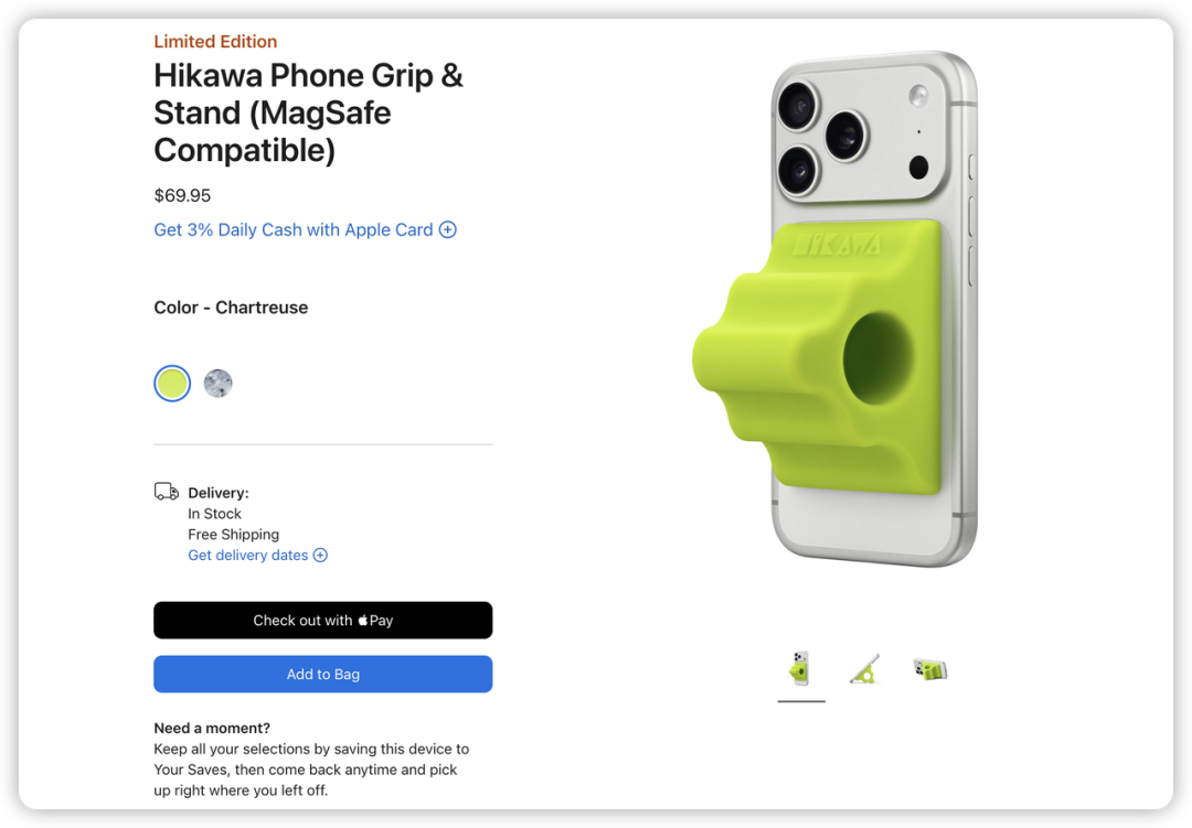 与此同时,苹果还上架了一款手机握把/支架:Hikawa。限量发售,售价约490元人民币。