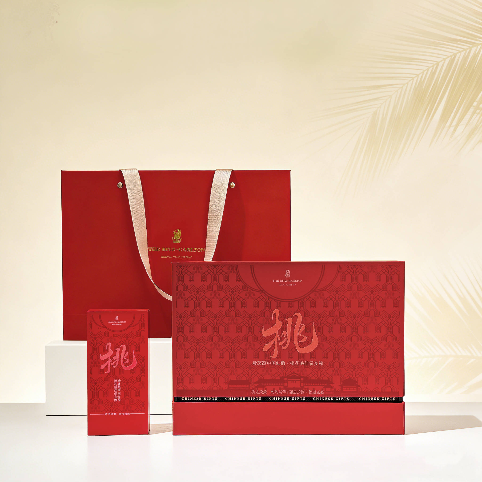 礼盒之上,黎族「大力神」图腾巍然伫立,寓意酒店如守护之神,伴每位绅士淑女抵达向往之地。中央一纸墨宝「桃」,源自《诗经》“桃之夭夭,灼灼其华”:一为「逃」,引您暂离尘嚣;二为「华」,礼赞璀璨年华;三为「桃」,祝福岁月绵长。