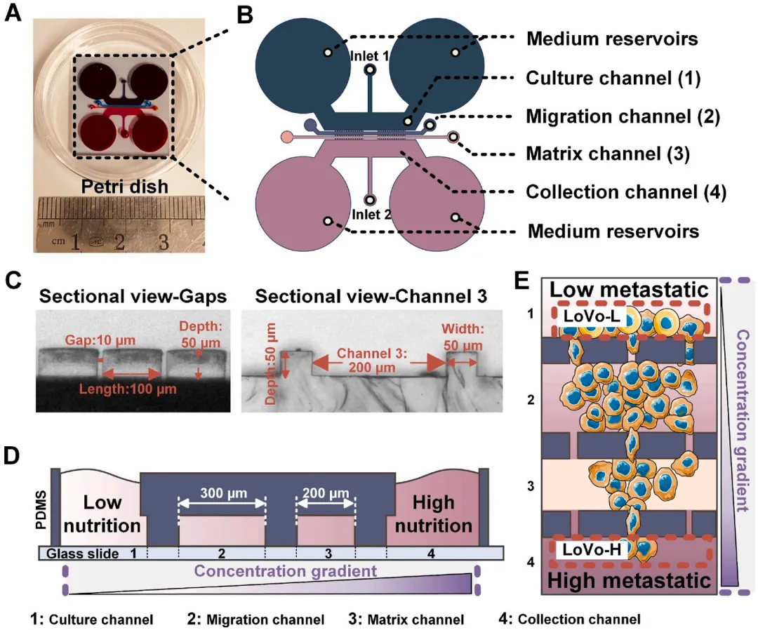 转移是恶性肿瘤的关键特征,复杂的癌症转移过程是癌症相关死亡的主要原因;原发性肿瘤中只有少数细胞亚系可能侵入基底膜并最终转移到远处器官,这种高度转移性细胞的选择和表征对于揭示转移机制、确定新的治疗靶点和筛选抑制转移的抗癌药物至关重要;微流控芯片可以进行高效的细胞筛选,有助于对转移过程进行详细的微观分析端粒酶负责细胞中的端粒延伸,并在维持基因组完整性、细胞增殖和细胞活性方面发挥重要作用;本研究中开发了一种用于研究高度转移性亚系及其亲本细胞中的端粒酶活性的研究方法,旨在阐明端粒酶在肿瘤转移中的作用。研究选择人结直肠癌细胞系LoVo作为研究对应,利用微流控芯片来识别具有高转移潜力的亚系,并通过RNA-seq高通量测序技术对肿瘤转移过程中分子表达变化进行详细分析。