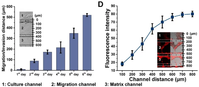在具有高转移潜能的细胞中,进行端粒酶活性的检测:将LoVo细胞接种到培养通道中,并驱动其沿着胎牛血清梯度迁移。在芯片上筛选高转移亚系细胞,并使用端粒酶检测探针进行端粒酶的荧光成像检测,结果显示细胞迁移能力和端粒酶活性呈正相关。