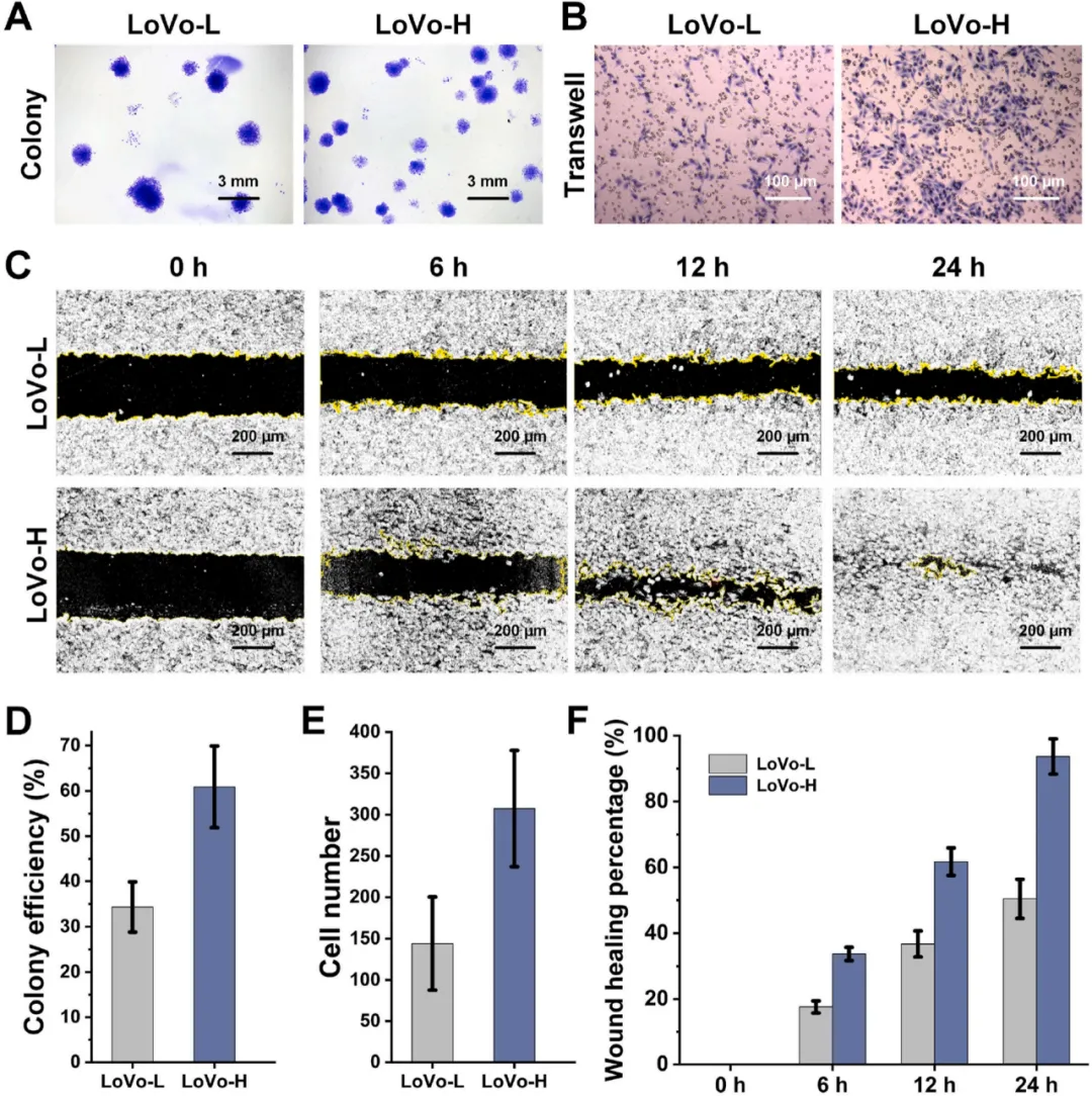 研究定义了第1通道中的细胞,其转移距离最短,转移能力较低,随后被命名为LoVo-L。第4通道的细胞转移距离最长,具有较高的转移能力,命名为LoVo-H。为了评估两个细胞亚系的增殖、迁移和侵袭能力,分别采用了集落形成实验、Transwell侵袭和伤口愈合实验,结果显示LoVo-H具有更强的体外增殖能力和侵袭能力,且LoVo-H亚系细胞表现出更强的恶性肿瘤特征.