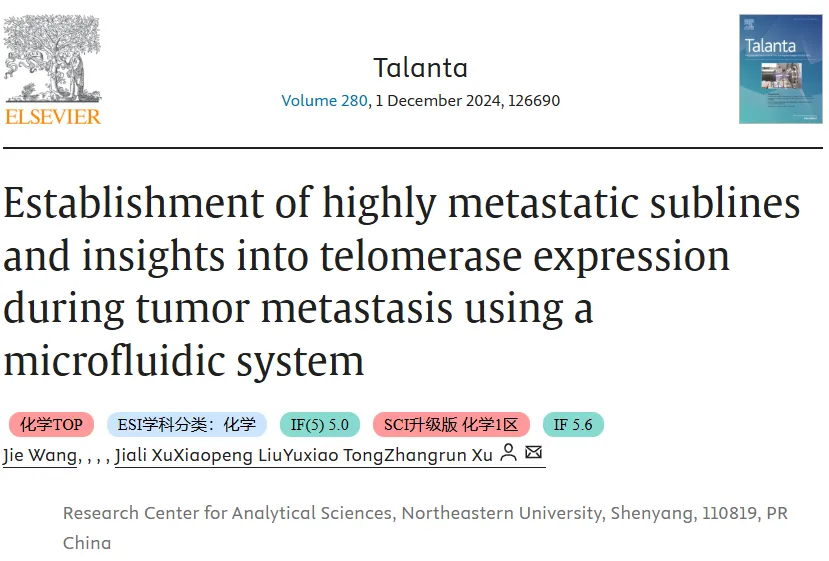 东北大学Zhangrun Xu*、Jie Wang , Jiali Xu等在一区期刊《Talanta》上在线发表了题为“Establishment of highly metastatic sublines and insights into telomerase expression during tumor metastasis using a microfluidic system”的期刊文章,文章描述了一种基于细胞侵袭性的差异来筛选高度转移亚系的微流控系统,并研究了癌症转移过程中端粒酶的表达。该研究中转录组测序和数据分析服务由元莘生物提供。