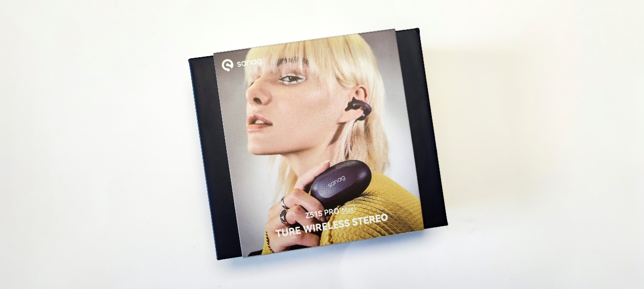 sanag塞那Z51S Pro Max开放耳夹式蓝牙耳机的包装采用了黑白撞色的设计,简约的设计风格,非常符合现代年轻人的审美。包装外面套有一个彩印封套,正面是产品模特实拍图,背面则是产品相关参数信息。