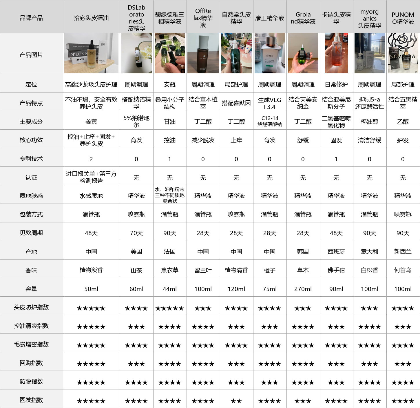 为了让大家快速看清这10款头皮精油的核心差异,我整理了一份实测参数对比表,所有数据都是这1个月我自己实测出来的,不掺假、不虚标,重点看质地、蓬松时长、控油力、吸收速度、成分安全性这些关键指标,帮大家快速初步筛选。