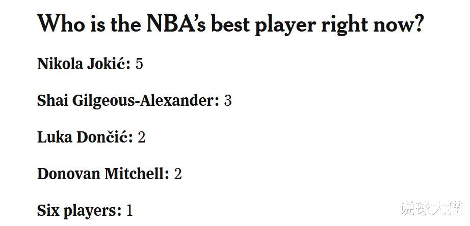 至于詹姆斯和库里这两大荣誉拉满的赛场迟暮巨星,于此均获得了0票!从目前的状态而言,41岁的詹姆斯和37岁的库里,之于比赛的影响力,在常规赛来看着实不如东契奇、鸭梨和尼古拉等。