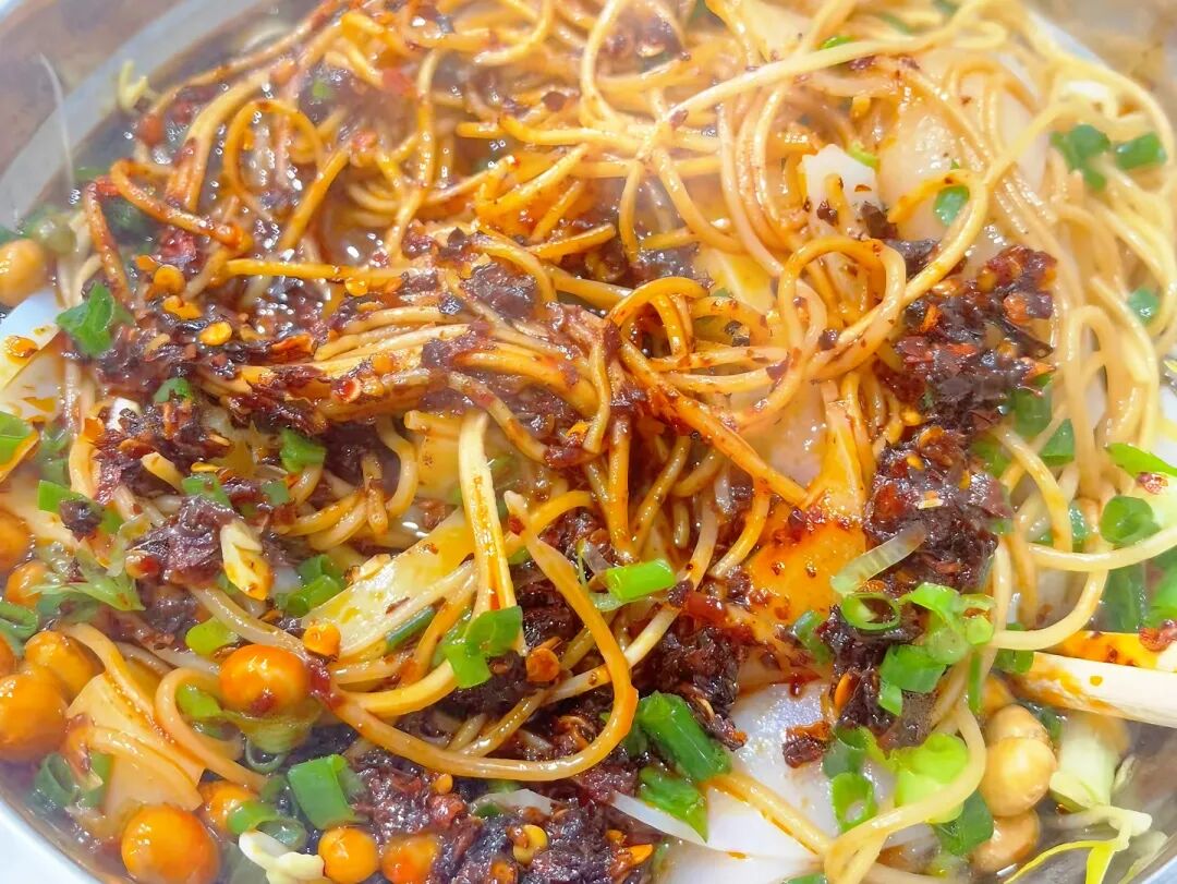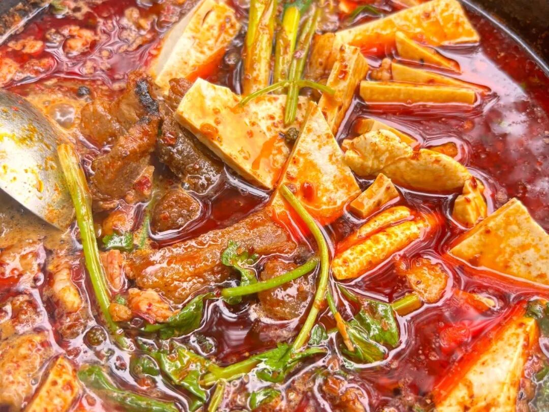 麻辣的豆豉红汤锅底里,一眼可见的就是毕节有名手撕豆干,QQ弹弹的,很有韧劲,吸满汤汁的豆干,麻辣酱香与豆香交织,这么入味的豆干比肉还诱人。锅底里还有被汤汁浸透的瘦肉片和半肥半瘦的油渣,每一片肉都是浓烈的麻辣酱香,再涮入蔬菜适时解腻,不炫两碗大米饭,根本打不住!
