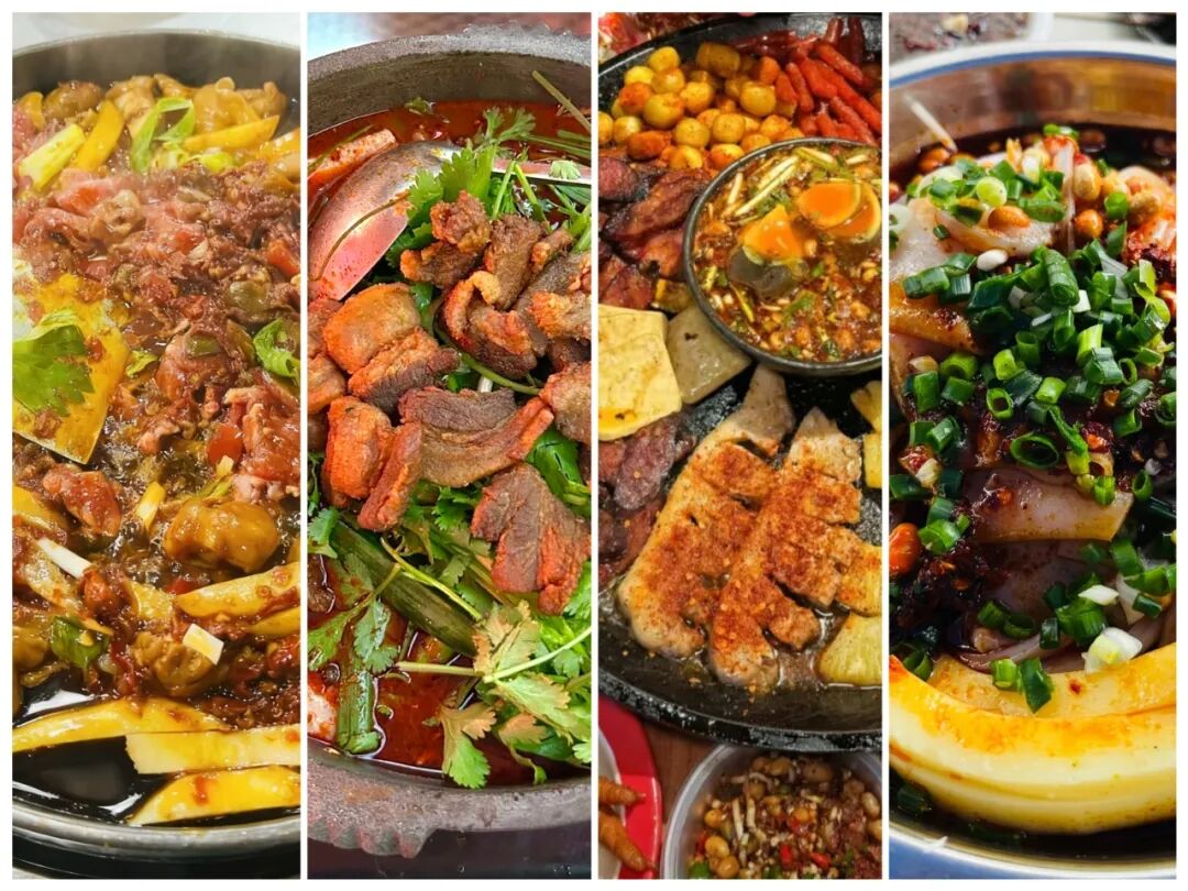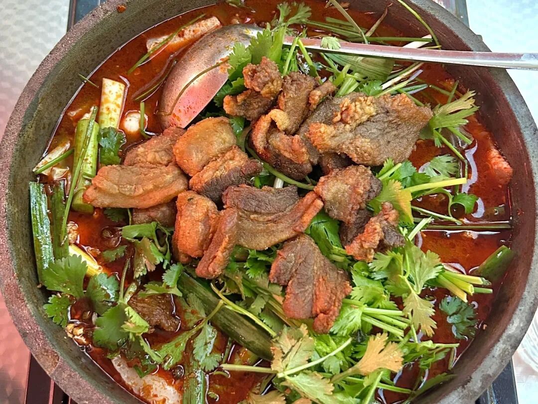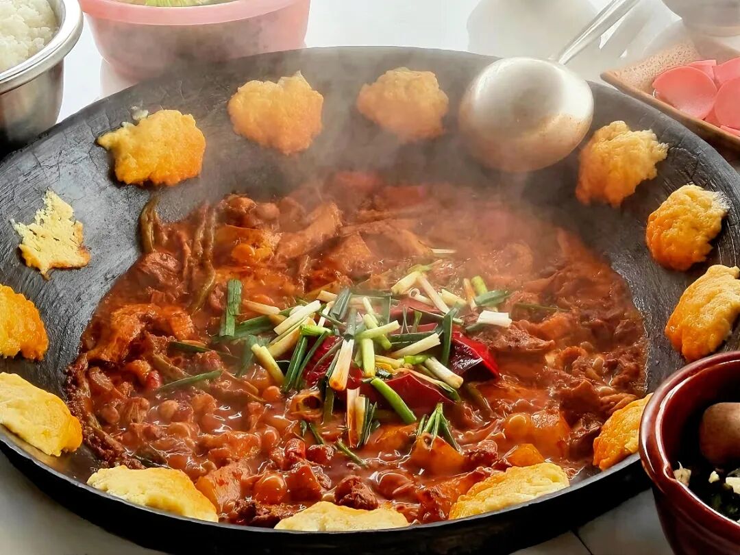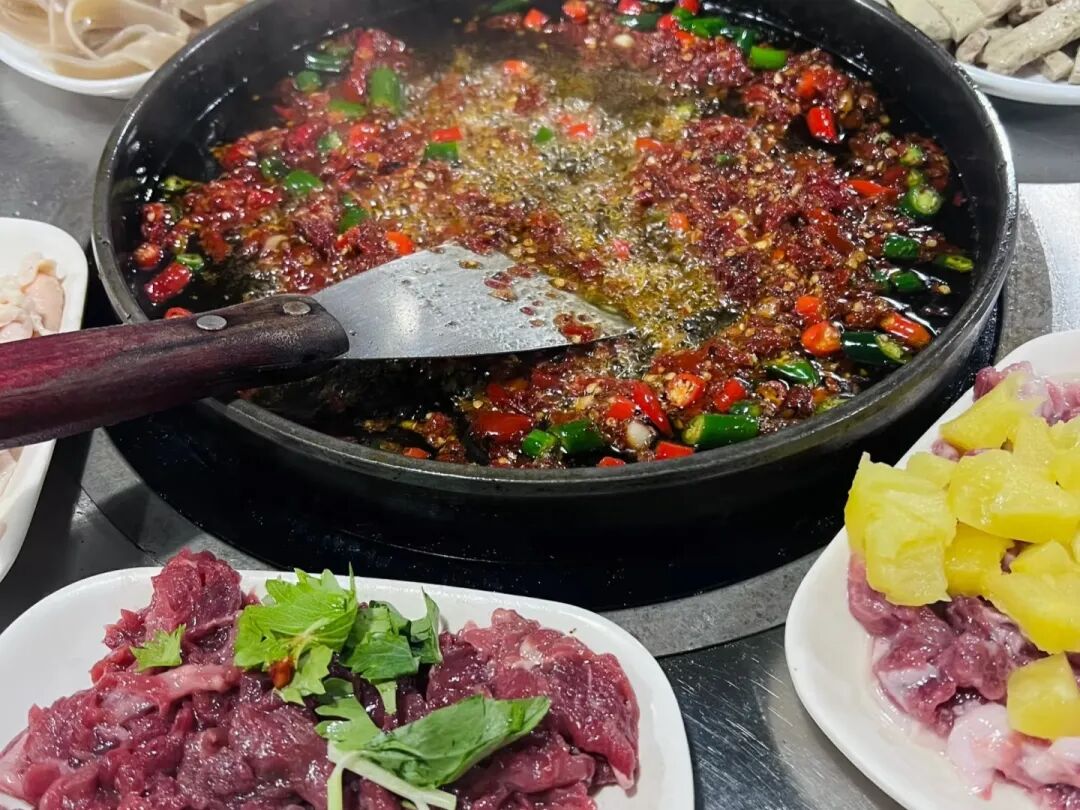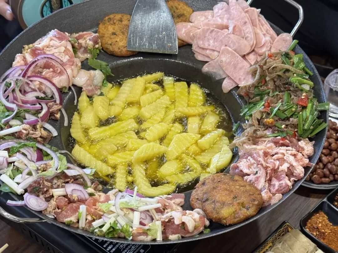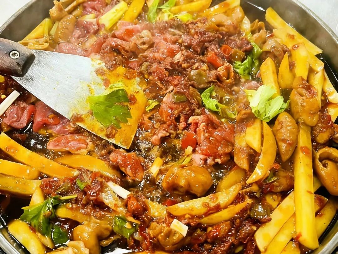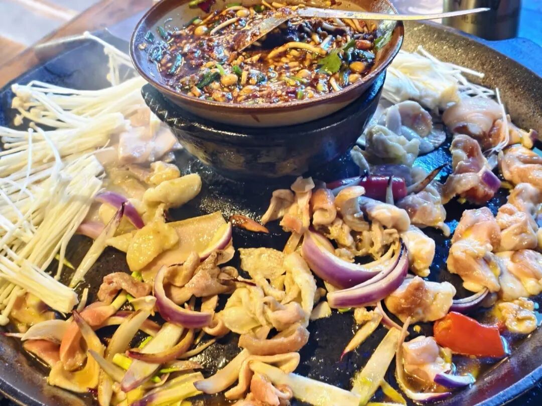 它的精髓是秘制辣椒底料,放入洋芋、小瓜、豆干等蔬菜,牛肉、板筋、肥肠等肉类现炒现吃,越炒越香,越吃越入味。麻辣风味的铁板烧,再配上一碗特色酸菜豆米汤和炒饭,纯享地道风味。