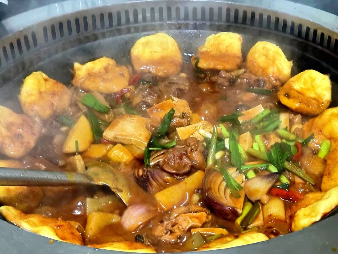 柴火鸡顾名思义就是在柴火灶上享用的鸡火锅,本地土鸡在柴火上烹饪,肉质细嫩鲜美,当地麻辣鲜香,蔬菜与鸡肉相辅相成,蔬菜融入鸡汤的浓郁,蔬菜增加清爽口感,锅口一圈的玉米馍馍,吸满汤汁,一半干爽扎实一半湿润浓郁,还承载着浓厚的玉米清香。