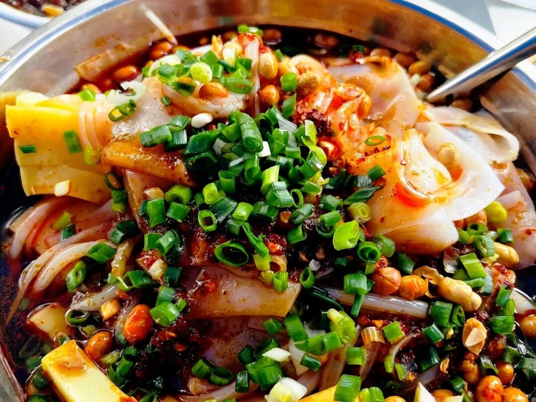 将夏天吃的解暑小食:凉糕、凉面、凉皮,加上酸菜、豆芽,淋入秘制油辣椒,一锅将其煮上,热辣可口,酸味为主,与凉吃时的口感有所不同,凉糕更加软糯,热气腾腾的汤汁呈现出冬天独有的风味,又解锁一个宝藏小吃的惊喜谁懂啊!