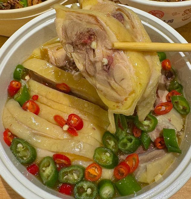 调味是灵魂所在,取青红小米椒各3根切圈,撒少许盐腌制10分钟,逼出辣味。热锅冷油,放入20克新鲜青花椒小火炸香,连油带椒倒入辣椒碗中,激发出复合香气。再加入2勺生抽、1勺蚝油、半勺白胡椒粉、适量盐和鸡精,倒入200毫升煮鸡的清鸡汤(过滤杂质后使用),搅拌均匀成汤汁。