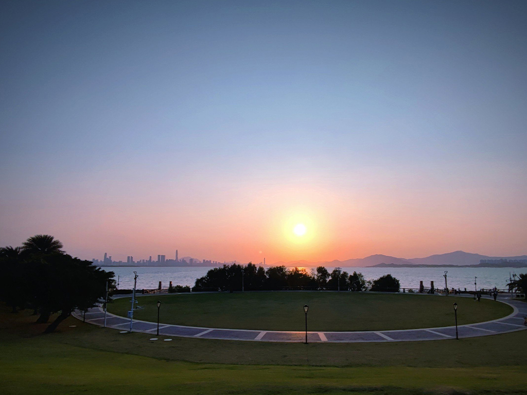 下一秒,太阳像个害羞的孩子,从山的那头探出头来,金红色的光芒瞬间铺满海面,顺着波浪的起伏,一路铺到我们脚边。草坪上响起一片轻轻的惊叹,所有人都下意识地举起手机,却又忍不住放下,只想好好接住这转瞬即逝的美好——被晨光镀上金边的侧脸,远处的香港山峦,横跨海面的大桥,还有身边人的笑意,都成了这幅晨光画卷里最动人的一笔。