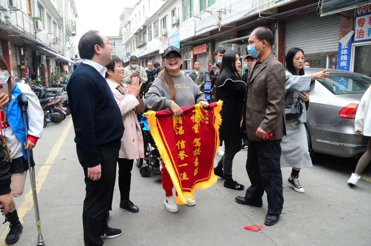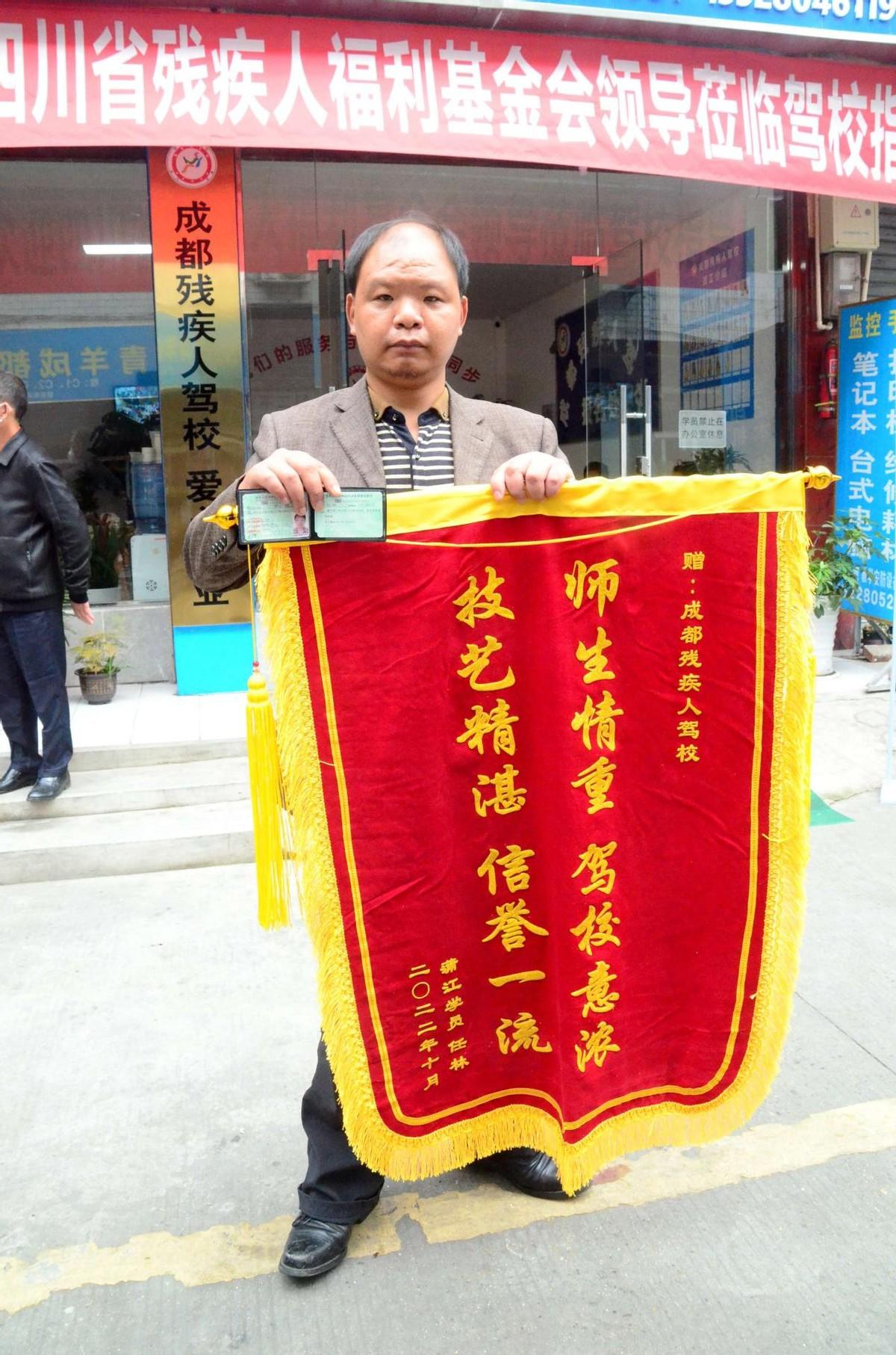来自蒲江县的肢残人任林只用了35天时间就拿到了驾照,当天他怀着激动的心情带上写着“师生情重 驾校意浓 技艺精湛 信誉一流”的锦旗来到成都残疾人驾校,向提供帮助和服务教练们表示衷心感谢。任林表示,他目前还在一家公司上班,在拿到驾照后准备自己创业,买辆车搞耙耙柑、不知火等果树种植销售。来自甘孜州丹巴县的、人称“断臂大侠”的张光君现场即兴书写“圆梦当下”,表达了在成都残疾人驾校学习和就业的残友们的共同心声。