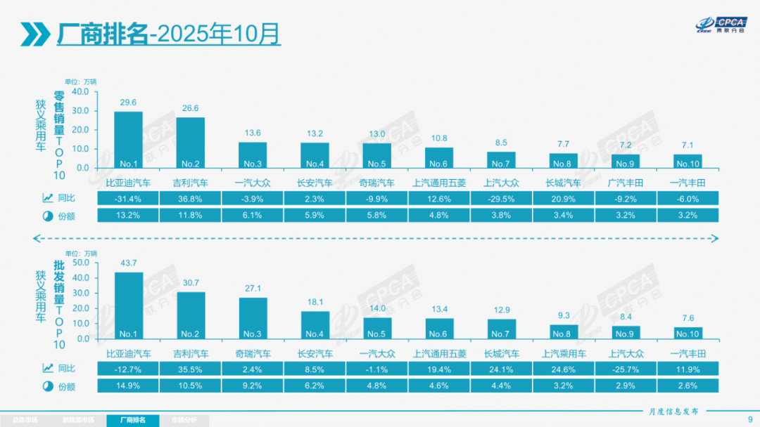 乘联分会发布的零售销量前十车企排名中,比亚迪以29.6万辆位居榜首,吉利、一汽-大众分别以26.6万辆和13.6万辆位居第二、三名。往后依次是长安(13.2万辆)、奇瑞(13.0万辆)、上汽通用五菱(10.8万辆)、上汽大众(8.5万辆)、长城(7.7万辆)、广汽丰田(7.2万辆)以及一汽丰田(7.1万辆)。