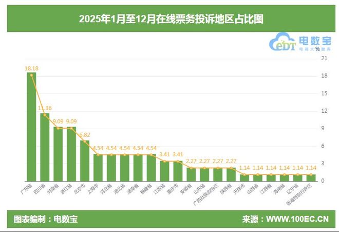 2025年1月至12月在线票务投诉地区分布上,广东省、四川省、河南省位列前三,其余分别为浙江省、北京市、上海市、河北省、湖北省、湖南省等。
