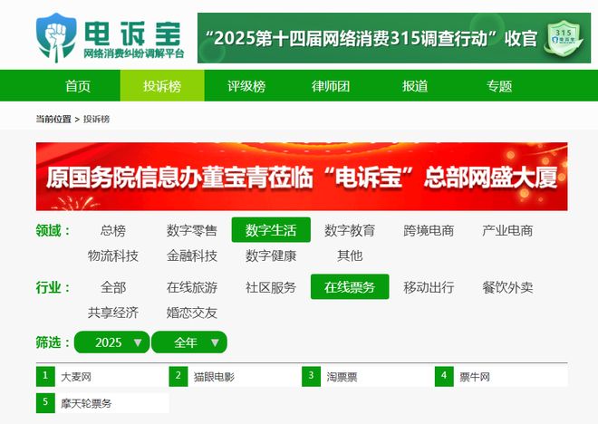 根据“电诉宝”2025年受理的中国在线票务领域用户有效投诉显示,入选投诉榜的依次为:大麦网、猫眼电影、淘票票、票牛网、摩天轮票务。此前,大河票务网等在线票务平台也遭遇过类似投诉。