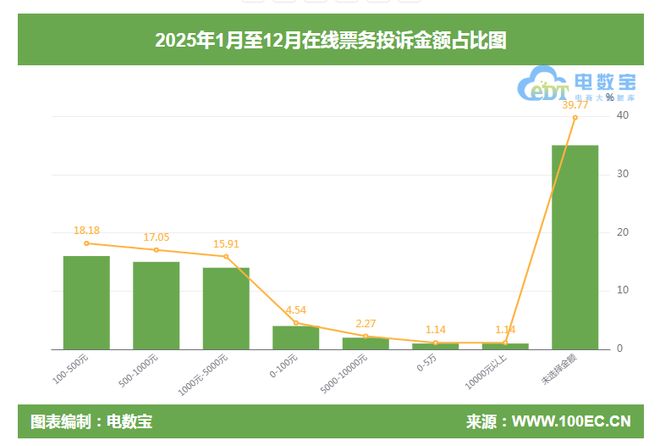 此外,在线票务投诉金额分布为:未选择金额(39.77%)、100-500元(18.18%)、500-1000元(17.05%)、1000元-5000元(15.91%)、0-100元(4.54%)、5000-10000元(2.27%)、10000元以上(1.14%)、0-5万(1.14%)。