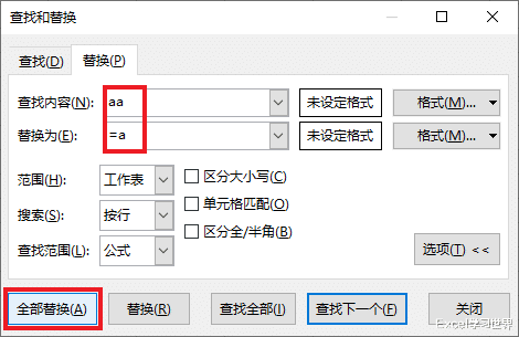 3. 按 Ctrl+H --> 在弹出的对话框中将“aa”替换为“=a”--> 点击“全部替换”