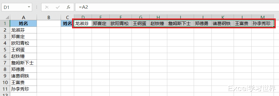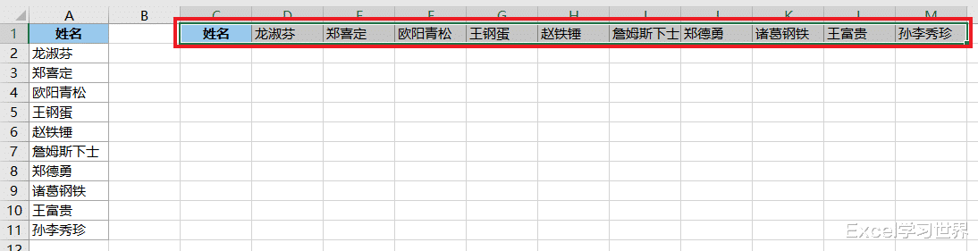 1. 复制姓名区域 --> 选中目标区域的第一个单元格 --> 选择任务栏的“开始”-->“粘贴”-->“转置”