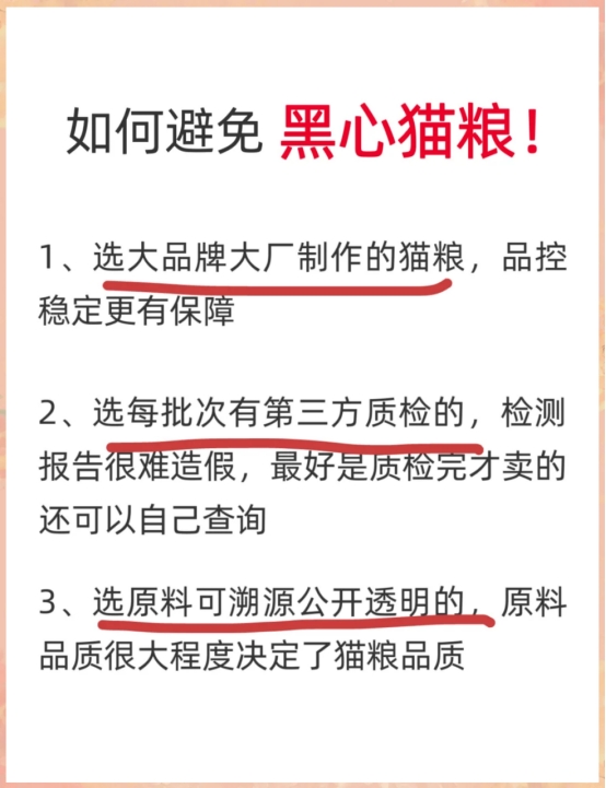 很多没有生产资质的小型作坊,核心业务就是做低价猫粮。他们要么用“超低价”做诱饵,把价格定得比市场价低不少,吸引想省钱的铲屎官;要么给猫粮加“美毛护眼”“肠胃调理”的花活,再砸钱打广告,让大家误以为是性价比好粮。但本质上,这类粮连第三方检测报告都拿不出手。原料品质、营养是否够,全靠厂家自己说,没有任何客观依据。一旦猫咪吃了出问题,想找生产源头要说法,根本找不到人。怎样挑选猫粮比较好?要避开这种坑很简单,选知名大厂生产的的猫粮,并且确认能提供第三方检测报告就行。