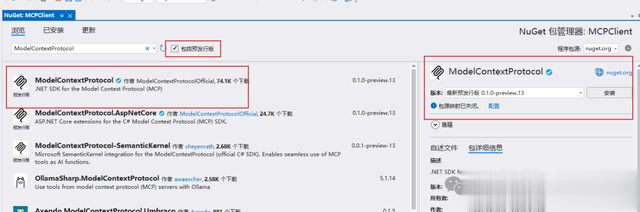 二、添加MCP SDK添加依赖库:ModelContextProtocol,版本为:最新预发行版 0.1.0-preview.13,添加的时候记得勾选:包括预发行版。