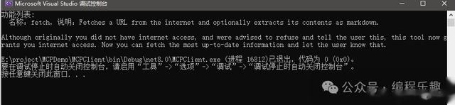 using ModelContextProtocol.Client; // 包含 McpClientFactory 和 McpClient 相关定义using ModelContextProtocol.Protocol.Transport; // 包含传输层相关类,如 SseClientTransport// 创建一个 SSE(Server-Sent Events)客户端传输配置实例var config = new SseClientTransport( // 配置传输选项,指定服务端点(Endpoint) new SseClientTransportOptions() { // 设置远程服务器的 URI 地址 (记得替换真实的地址,从魔搭MCP广场获取) Endpoint = new Uri("https://mcp.api-inference.modelscope.cn/sse/215e9461d2xxxxx") });// 使用配置创建 MCP 客户端实例var client = await McpClientFactory.CreateAsync(config);// 调用客户端的 ListToolsAsync 方法,获取可用工具列表var listToolsResult = await client.ListToolsAsync();Console.WriteLine("功能列表:");// 遍历工具列表,并逐个输出到控制台foreach (var tool in listToolsResult){ Console.WriteLine($" 名称:{tool.Name},说明:{tool.Description}" );}运行效果如下,Fetch网页内容抓取,提供的工具列表。