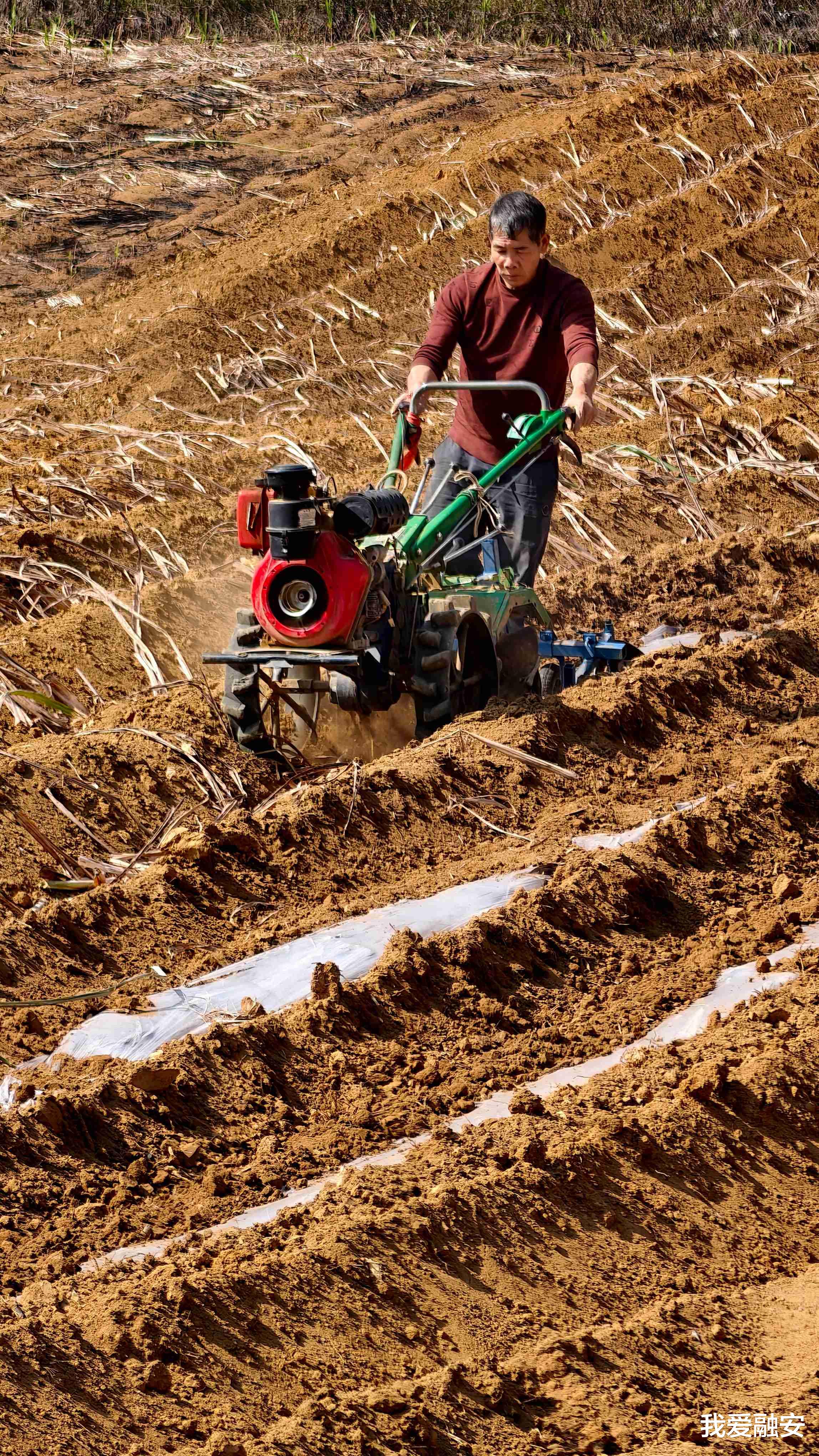 2026年1月28日,在广西柳州市融安县沙子乡古益村,农民驾驶微耕机耙田,种植甘蔗。