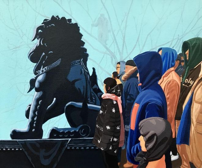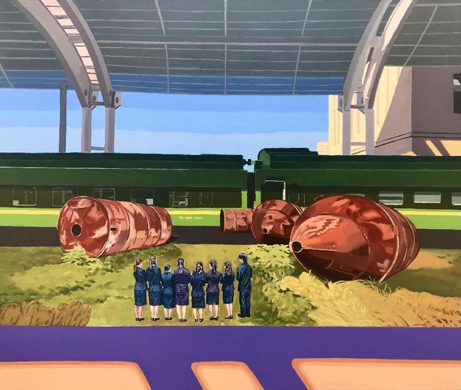 刘海舟的作品就印证了这种貌合形离的状态,表面合得来,而实质上却又差异很大。他大量地运用了网络图片和自拍的场景,经过画面的块面化和分层处理,呈现出一种隔世感觉。如刘海舟所说“我近期的作品都是从收集的图片资料中随机抽取三张图片,然后重新组合,达到一种似是而非的感觉,即真实又虚幻。对于观众来说,他们体会到的感受就是我要传达感受。”这种对二手图像的再次处理和改造,打破了原有图片的主客体的关系,也把时间和空间的过程视觉化,各种图像的打碎,重新组合,制造出一种新的绘画景观。刘海舟的早期作品更加注重宏大叙事下的社会现实意义,一种物欲横溢的消费文化的现实场景,近期绘画也延续这种叙事方式,但却大相径庭。他把叙事性和拼贴的方式结合起来,类似于蒙太奇的方式,对原有图片人物和场景进行调整和改造,打乱其背景和叙事结构。组合成复杂而暧昧的关系。同时他也更加注重画面空间革新,把具象和抽象的方式运用自由。那些具有空间感却迷失方向的风景,好似一场无知觉的梦境,犹如一场个人历史中的片段记忆。让人觉得既疏远又陌生。恰合了当下社会环境和我们日常生活的现状,貌合形离、即荒诞又真实,即真实又虚幻。