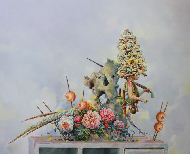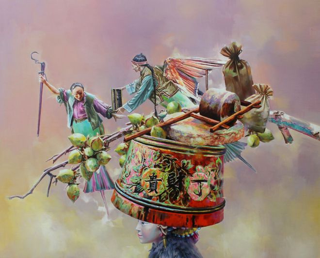 上世纪60年代欧美的“拼贴”艺术风靡一时,这股潮流在波普艺术和超现实艺术越刮越烈,直到21世纪深入艺术的各个领域。目前许多中外的艺术家都把过去艺术和现在情境相结合,重新对当下物质化和碎片化的反思,形成各种新的语言方式和思维空间。无疑伊小东近期的绘画也借鉴了这种艺术形式,他将过去戏剧的人物和“面具”有分别的融入当代语境,进行杂糅与混搭,试图唤醒人们对内在精神的潜意识关注。这些具有象征性、符号化和装饰性的“面具”,借古喻今,意在言外。营造出一种光怪陆离的魔幻情境。