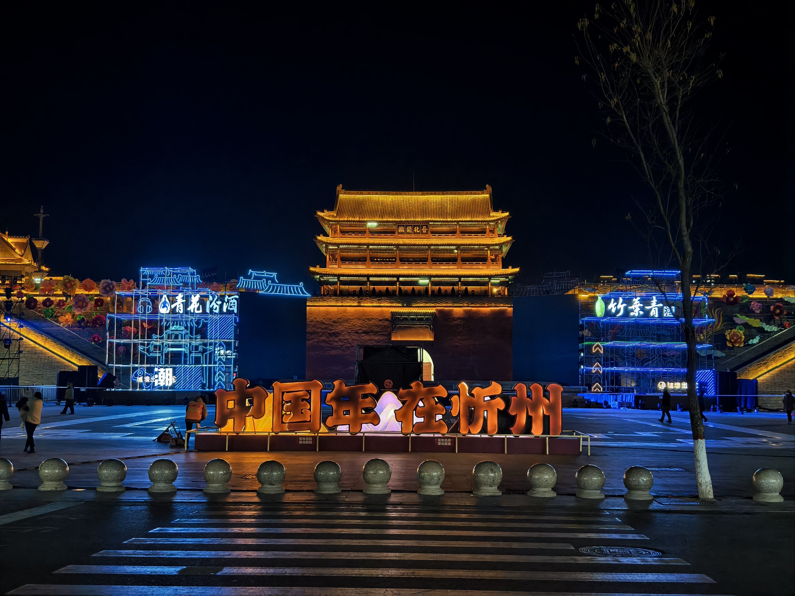 南城门楼(晋北锁钥)(地标象征):登楼可俯瞰古城全景,城楼下“忻州古城”照壁嵌有“三关总要”石刻,夜间灯光映照下,城砖上的弹孔(抗战时期遗留)与灯笼的红光交织,诉说着古今交融的故事;