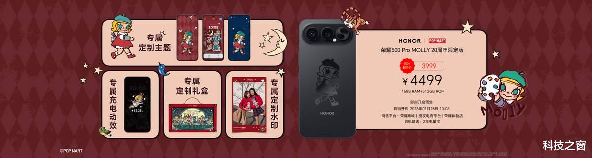 随着联名限定款的加入,荣耀500系列也为追求不同体验的消费者提供了可靠而丰富的选择。据悉,荣耀500 Pro MOLLY 20周年限定版即刻开启预售,并将于1月25日10点08分在荣耀商城等全渠道正式开售。不仅如此,自1月23日起,荣耀还将在北京、上海等全国多座城市陆续打造联名主题店与线下快闪活动,让喜爱MOLLY与科技潮流的你,能够亲身沉浸体验。