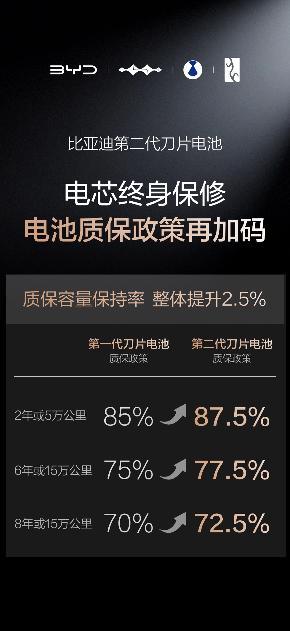 至于快充会不会对电池寿命造成影响,就这么说吧,第二代刀片电池甚至比第一代刀片电池更耐用了,电池质保的容量保持率提升到了77.5%,如果容量低于了这个数值免费包换,而且电芯依然是终身保修,如果闪充对电池寿命影响大,厂家肯定是不敢做这样的承诺的。