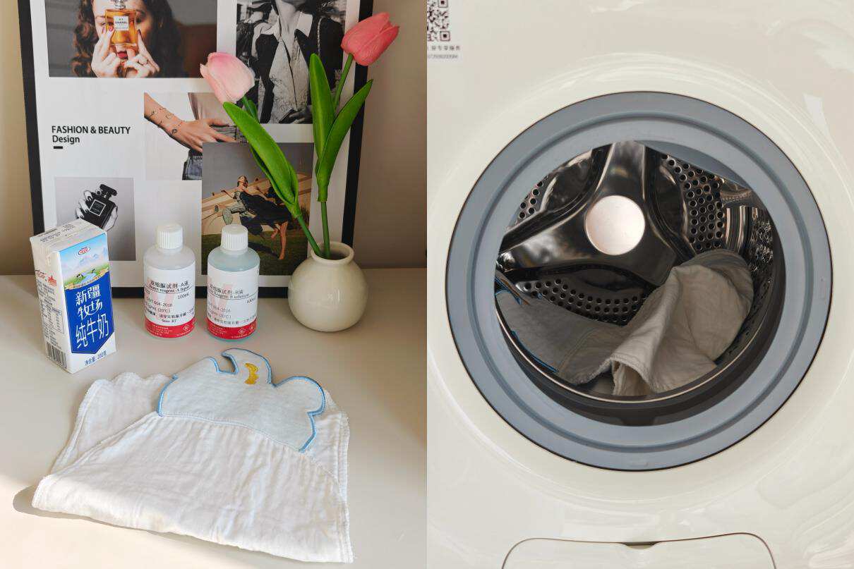 记得在孩子小月龄的时候,我每天都有洗不完的口水巾。口水巾上的奶渍很难洗干净,而且因为奶液颜色又浅,光靠肉眼很难判断到底有没有彻底洗净。为了搞清楚小吉的洗涤能力,我特意准备了两瓶双缩脲试剂来实测一下。