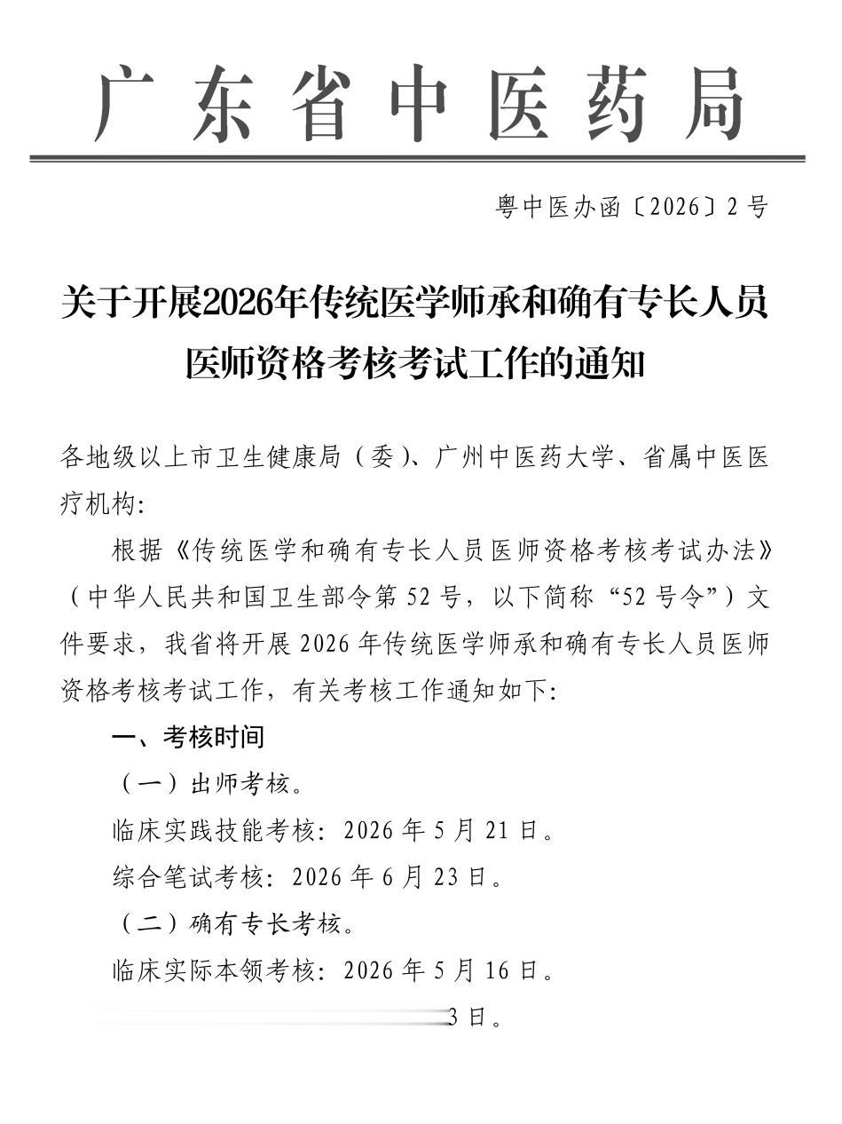 根据《传统医学和确有专长人员医师资格考核考试办法》(中华人民共和国卫生部令第 52 号,以下简称“52 号令”)文件要求,我省将开展 2026 年传统医学师承和确有专长人员医师资格考核考试工作,有关考核工作通知如下: