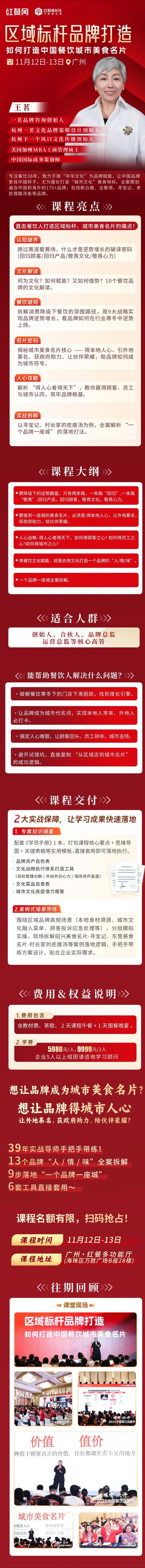 11 月 12 日 - 13 日,深耕餐饮 39 年的实战导师王茗将在广州开讲“区域标杆品牌打造:如何打造中国餐饮城市美食名片” 公开课,带着 170 + 品牌全案经验,用 6套工具,13个品牌案例,帮你打通从区域店到城市美食名片的进阶之路。
