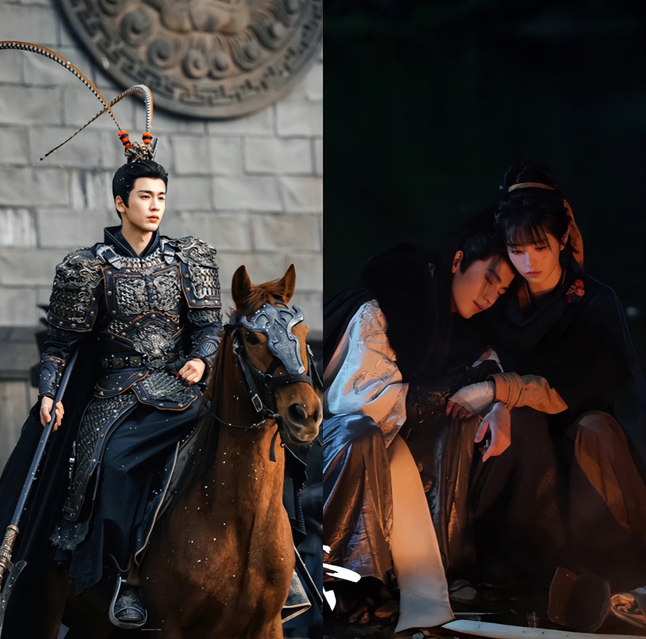 《逐玉》更是把谢征双重身份的反差外化到妆造上,“切号”武安侯时,一袭铠甲、头戴神似齐天大圣造型的凤翅紫金冠,威风凛凛。