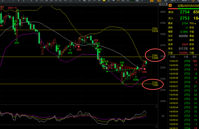 技术指标:今日豆粕价格在5日、10日均线之间震荡,短期趋势不明朗;60分钟RSI约48,处于中性偏弱区域,5分钟在2740-2755箱体整理,突破动能不足。
