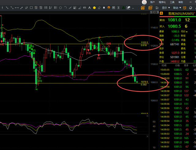 技术指标:今日焦煤价格处于各周期均线下方,短期下跌趋势明显;60分钟RSI约45,处于中性偏弱区域,5分钟在1090-1105箱体整理,反弹动能不足。